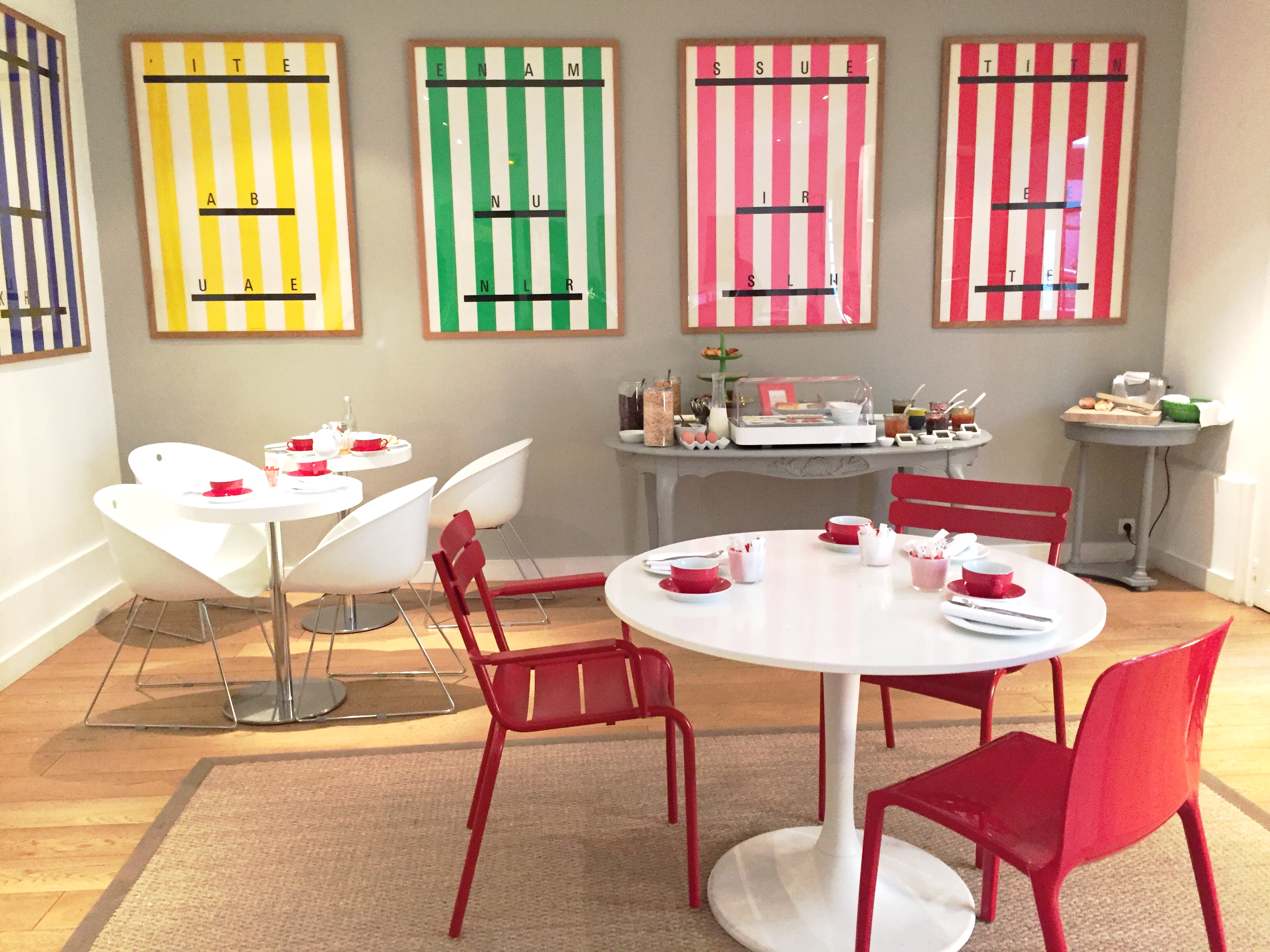 Breakfast is one of my favourite things there. Fresh orange juice, a home made cake, some ham, cheese, of course great pastries and bread with butter and jam. The tea is from Marriage Frères, the great French tea brand. You can have breakfast until 10:30. The mostly white and bright colours room wakes you up gently and gives you energy as soon as you walk in.